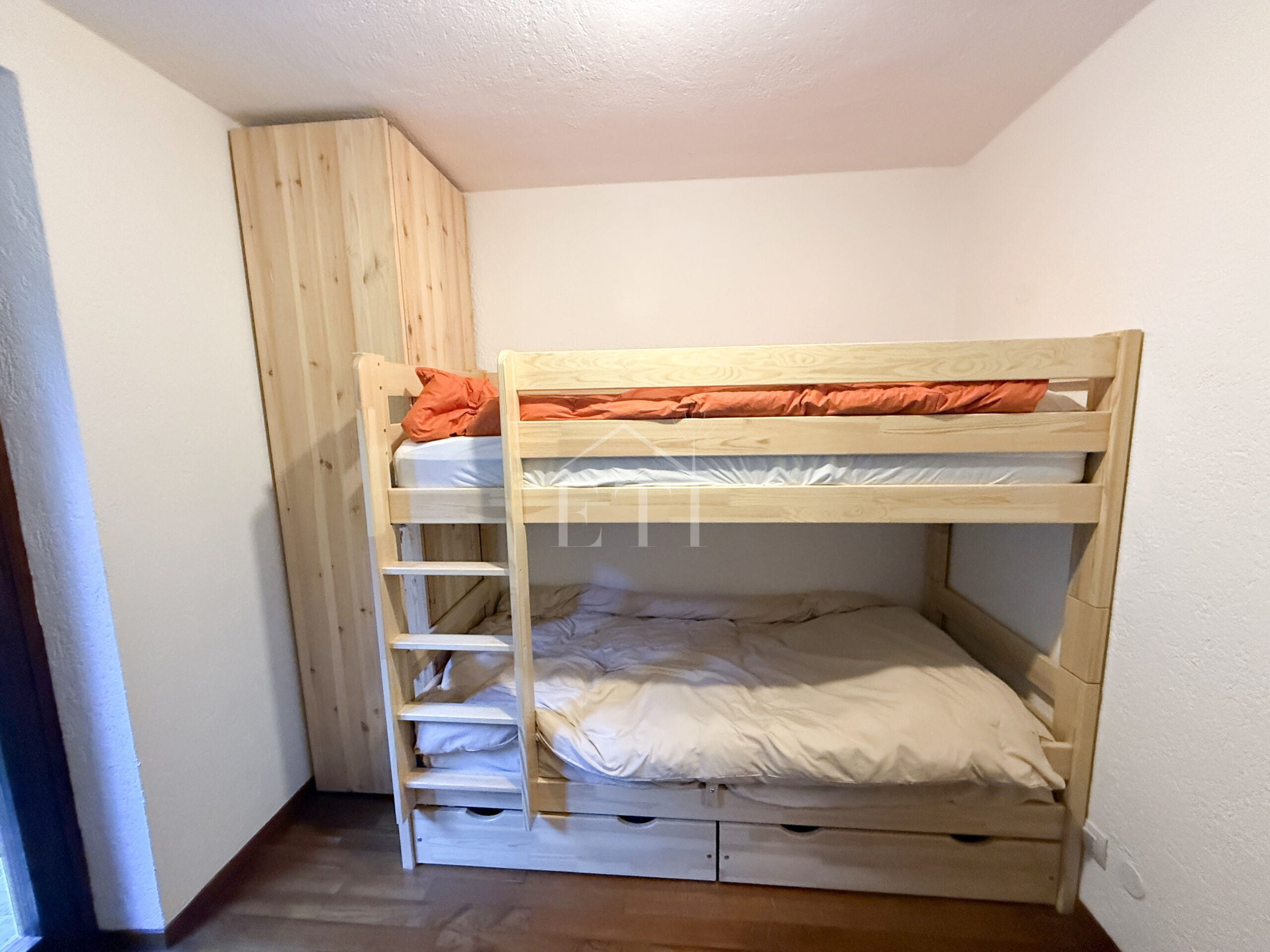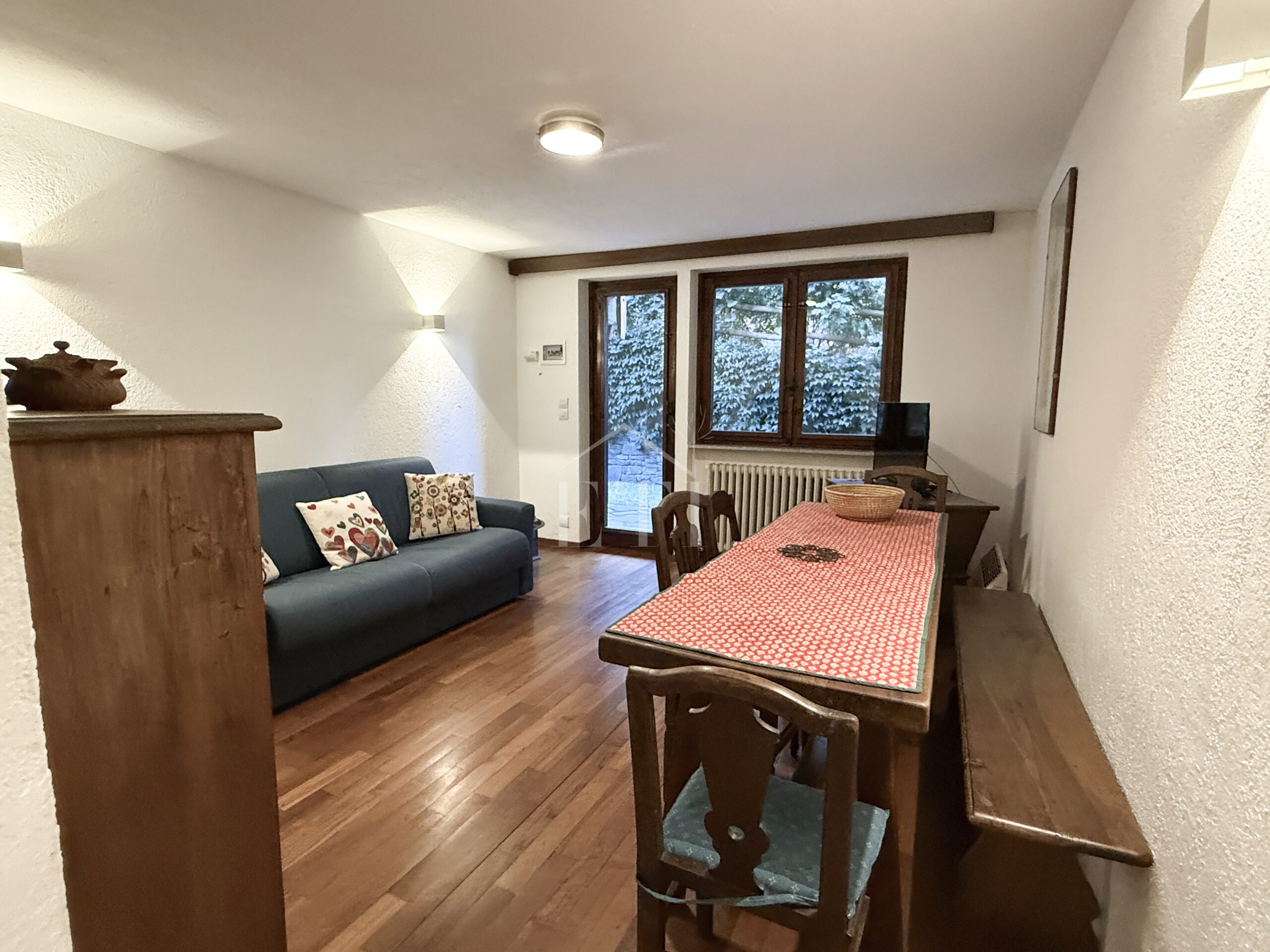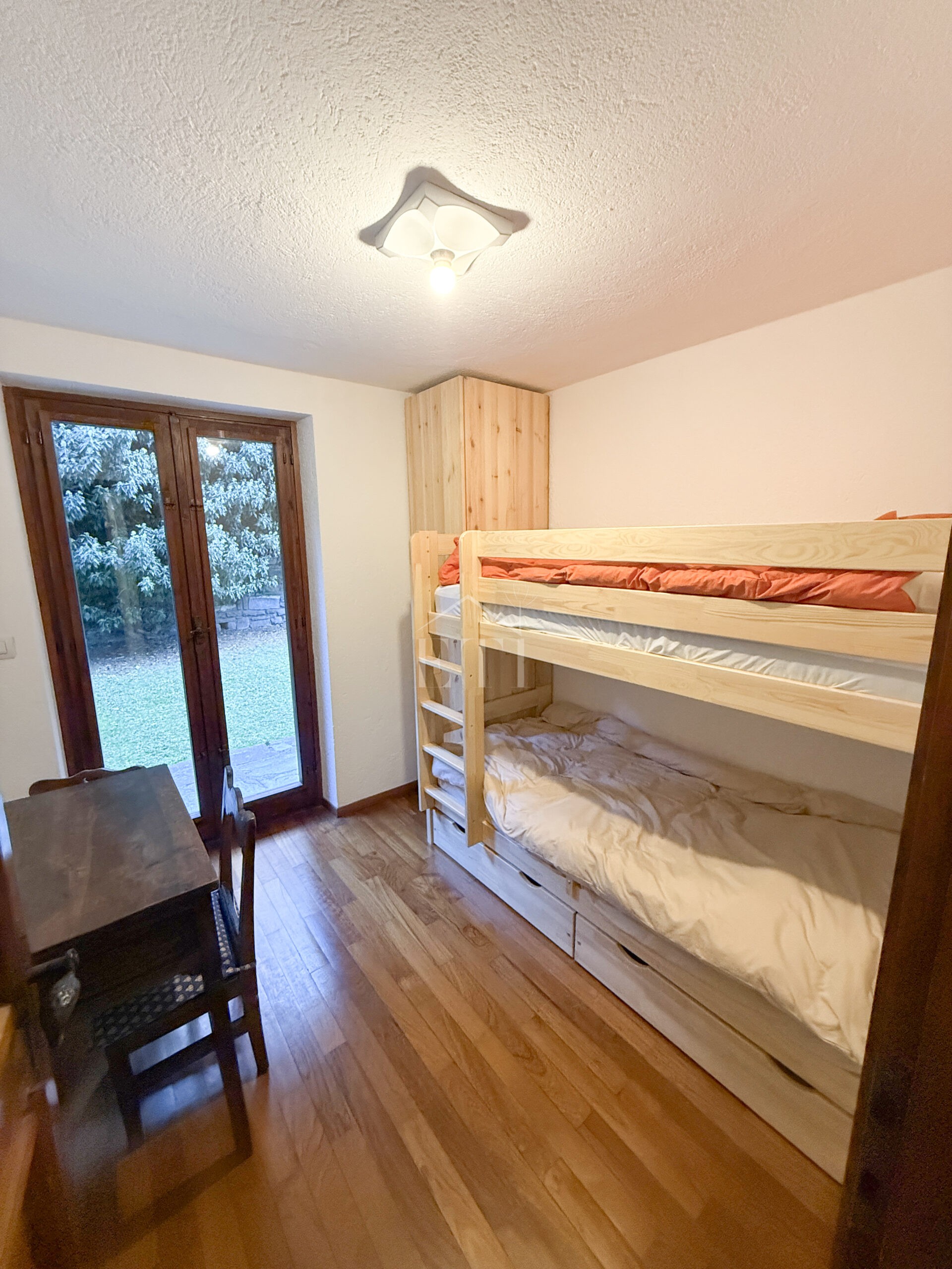 AFFITTO Trilocale al Verrand di Pré-Saint-Didier, piano terreno con giardino ad uso esclusivo composto da ingresso su zona giorno, cucinino separato, camera da letto matrimoniale, camera con letto a castello e bagno.